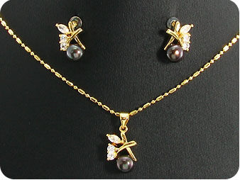 3x9mm Black Pearl Topaz Gold Pendant Earrings Set