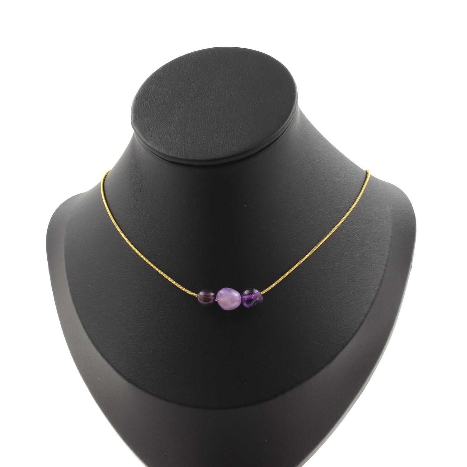 Amethyst from Brazil 3 beads necklace, golden stainless steel chain length 45 cm. We can make it to your length on request. Made in France in our A Bijoux workshop. Delivered in a box pouch. Necklace for women, men, children.
