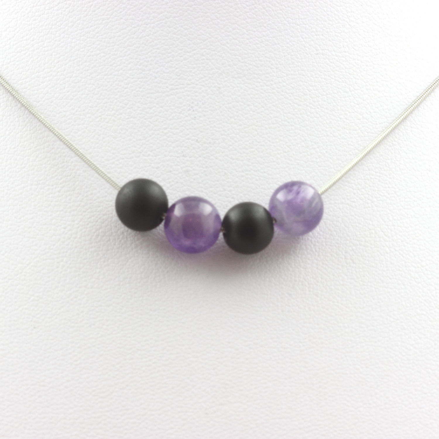 Amethyst + Matte Black Onyx 8 mm beaded necklace Stainless steel chain