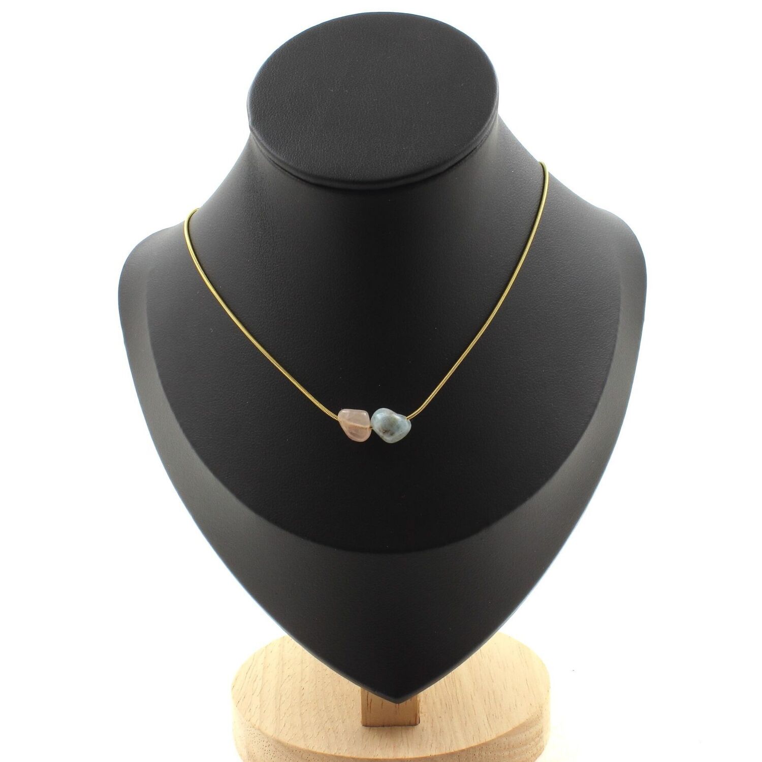 Beryl Morganite from Brazil 2 beads necklace, golden stainless steel chain length 45 cm. We can make it to your length on request. Made in France in our A Bijoux workshop. Delivered in a box pouch. Necklace for women, men, children.