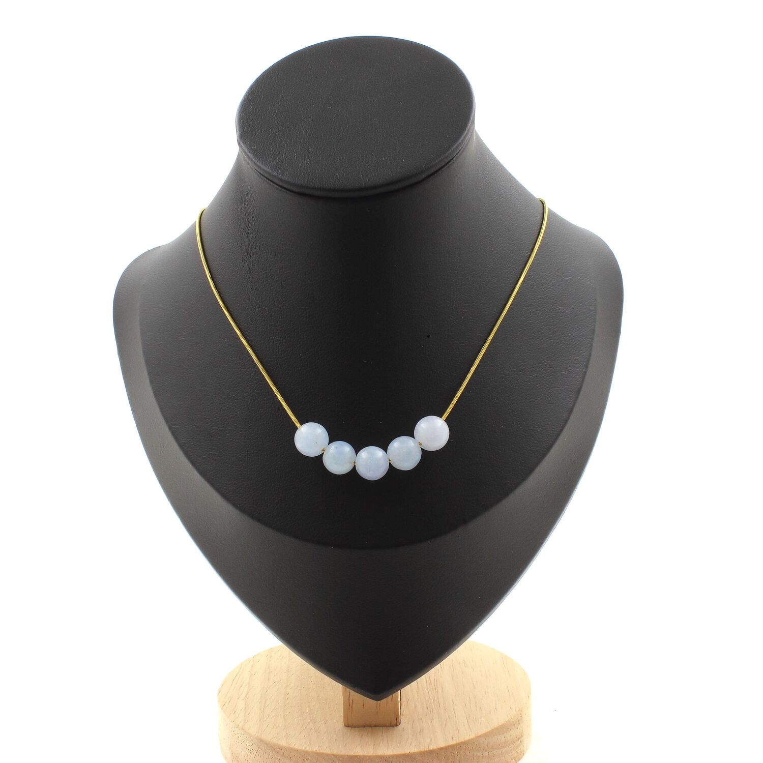 Blue Chalcedony 5 beads 8 mm necklace, golden stainless steel chain length 45 cm. We can make it to your length on request. Made in France in our A Bijoux workshop. Delivered in a box pouch. Necklace for women, men, children. Discover more than 1000 models of necklaces made by the A Bijoux brand with new arrivals every day.
