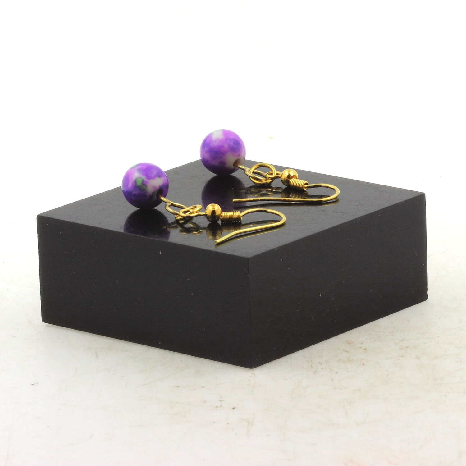 Boucles D'oreilles en acier doré inoxydable hypoallergénique 1 Perle Jaspe violet bleu 8 mm.