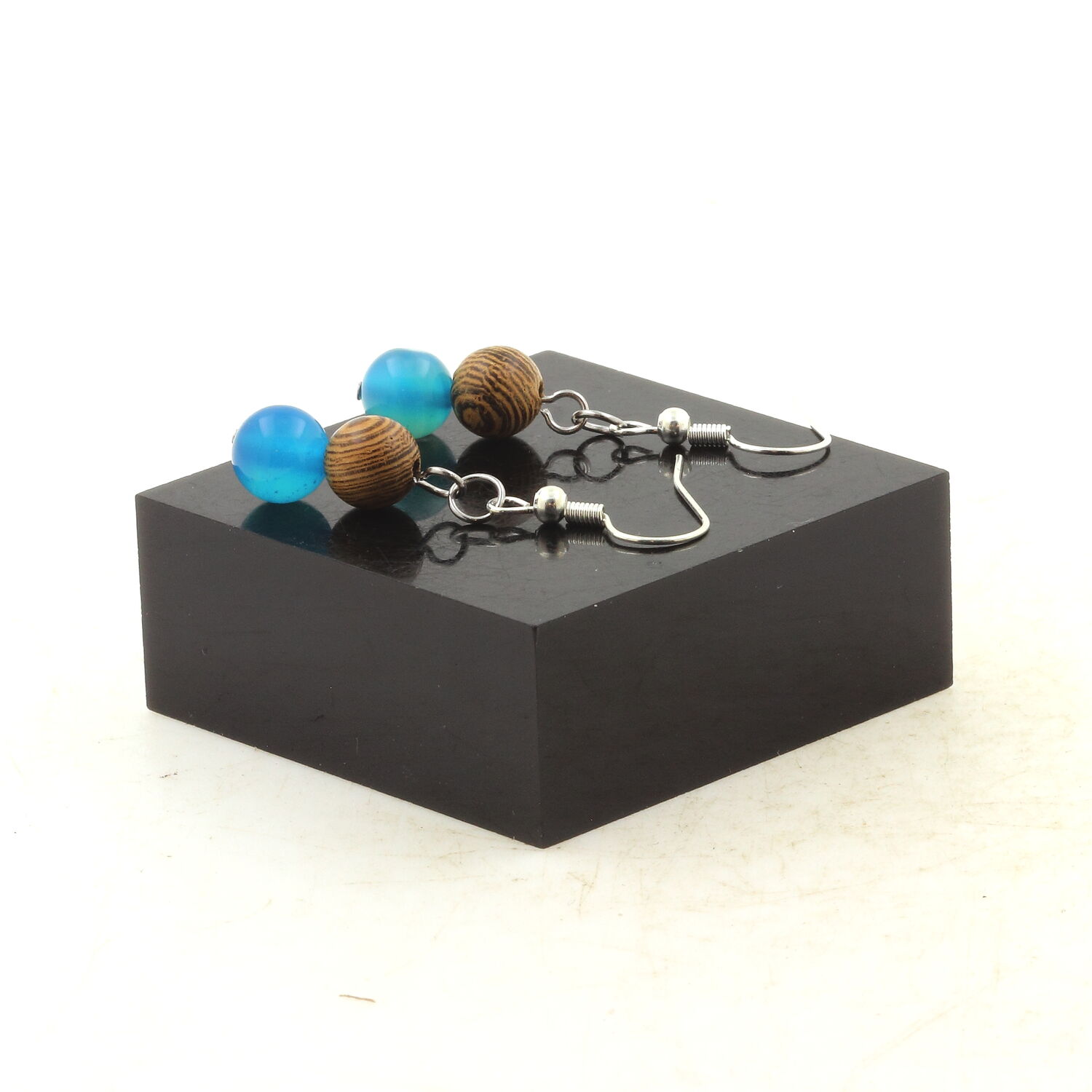 Boucles D'oreilles 2 Perles Agate rubanée bleu + bois 8 mm en acier inoxydable.
