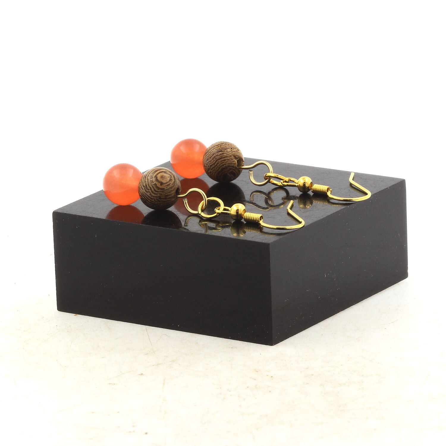 Boucles D'oreilles 2 Perles Calcédoine orange + bois 8 mm en acier doré inoxydable.
