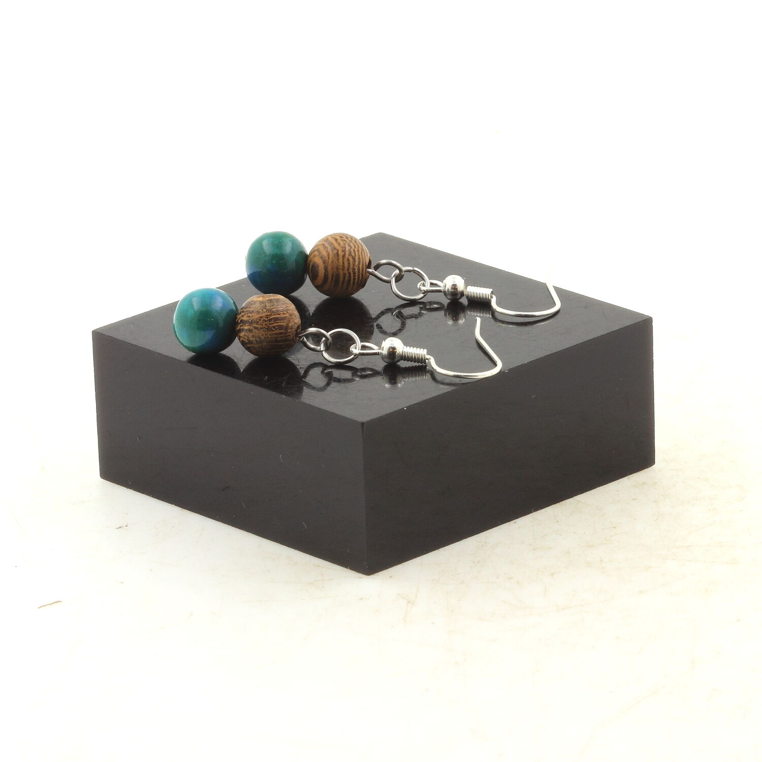 Boucles D'oreilles 2 Perles Chrysocolle Teintée + bois 8 mm en acier inoxydable.