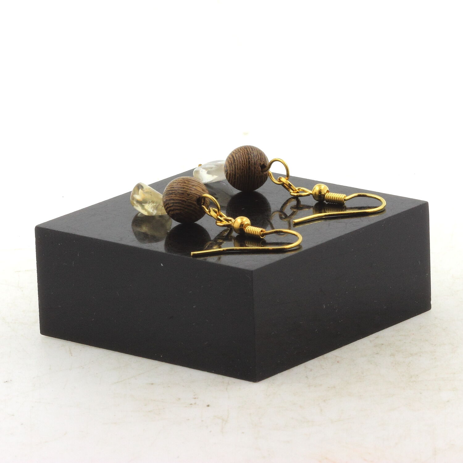 Boucles D'oreilles en acier doré inoxydable hypoallergénique 2 Perles Citrine du Brésil de forme libre 5 mm-8 mm + bois 8 mm.