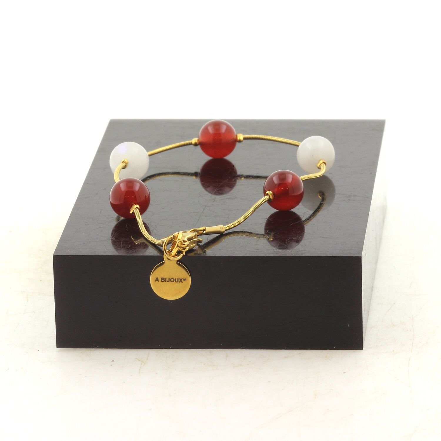 Bracelet en acier doré inoxydable 5 Perles Pierre de Lune + Agate rouge 8 mm.
