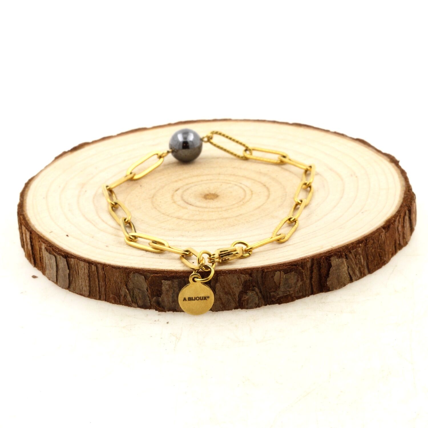 Bracelet en acier doré inoxydable double chaine (3x11mm) 1 Perle Hématite 8 mm.