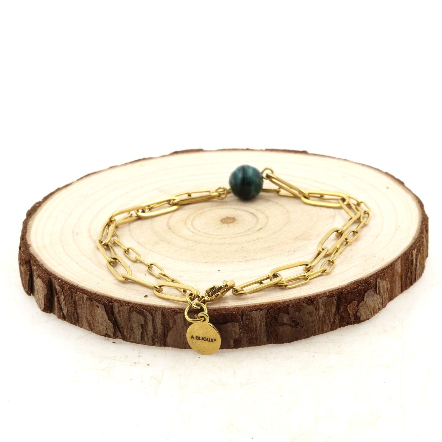 Bracelet en acier doré inoxydable double chaine (6x2 & 12x4 mm) 1 Perle Emeraude de Zambie 8 mm.