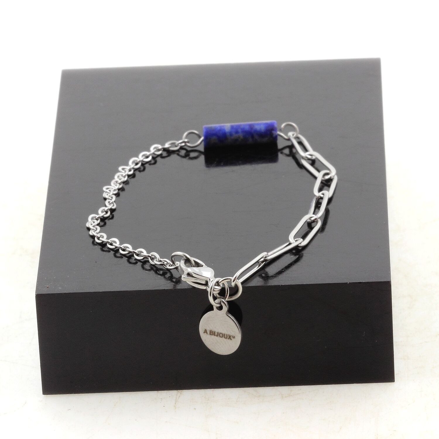 Bracelet en acier inoxydable double chaine 1 Perle Lapis Lazuli 4x13mm cylindre.