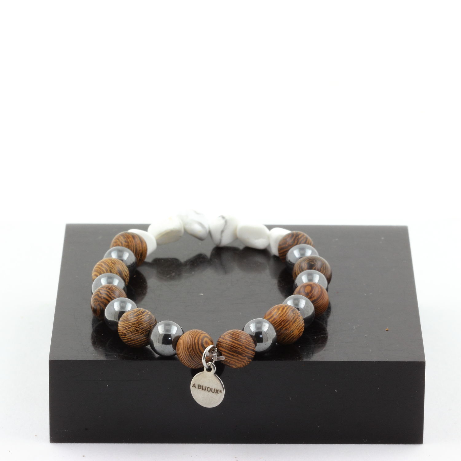 Bracelet Howlite des USA + Perles Hématite + bois 8 mm.