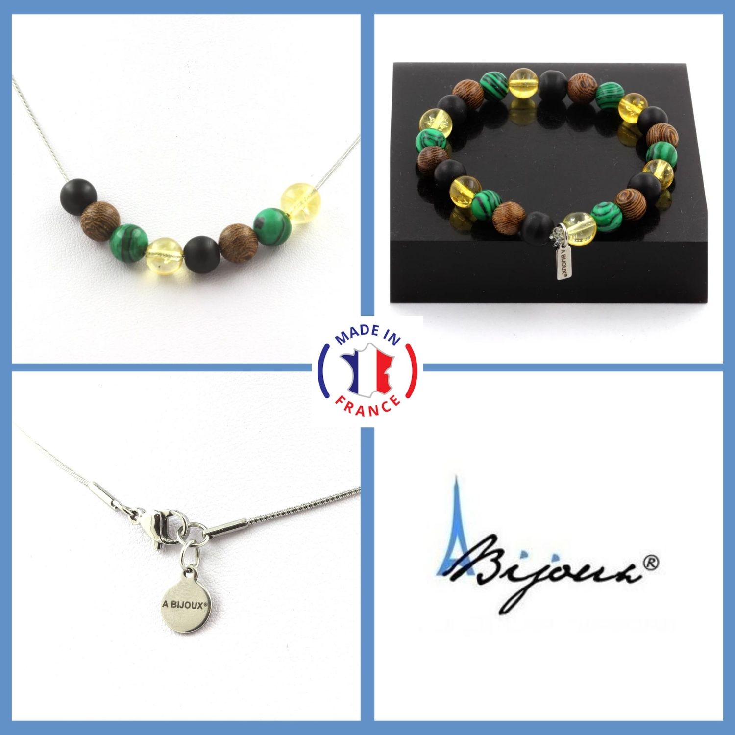 Necklace Set Citrine + Malachite + Matte black Onyx + wood Beads 8 mm Stainless steel chain length 45 cm. We can make it to your length on request.
