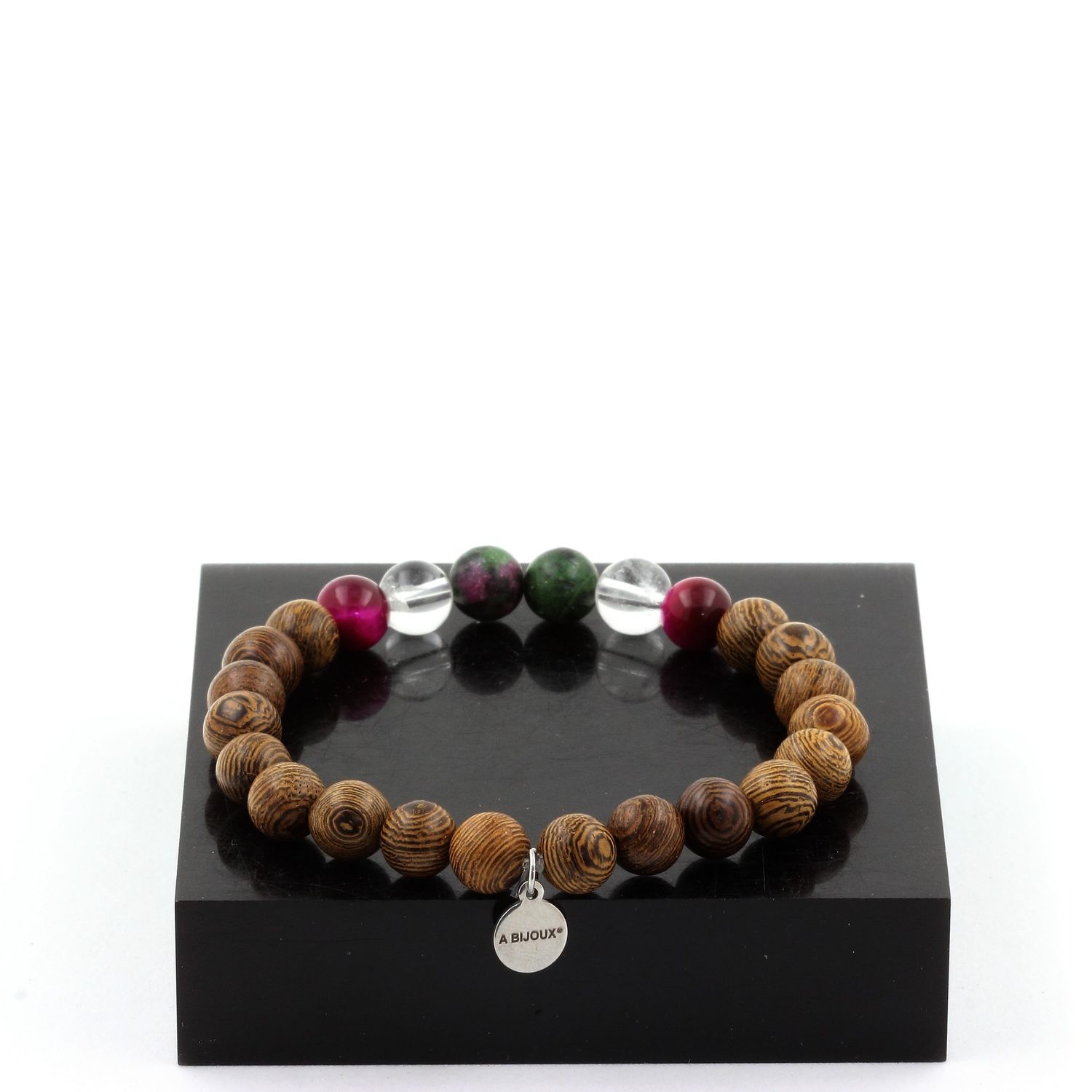 Bracelet Perles Epidote d'Australie + Oeil de Tigre Fuschia + Quartz + bois 8 mm.