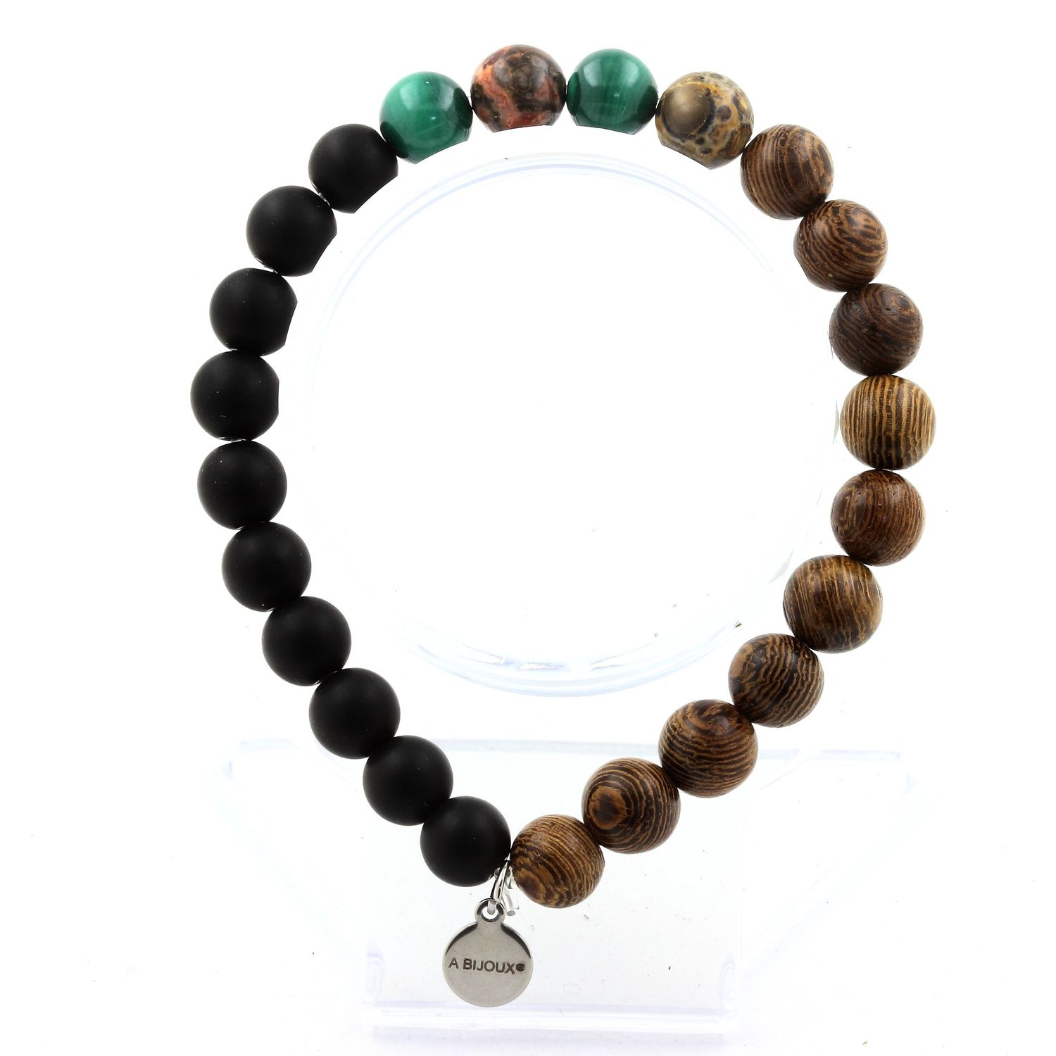 Bracelet Perles Malachite du Congo + Jaspe léopard + Onyx noir mat + bois 8 mm.