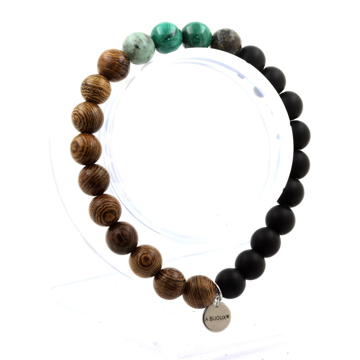 Bracelet Perles Malachite du Congo + Turquoise Africaine + Onyx noir mat + bois 8 mm.