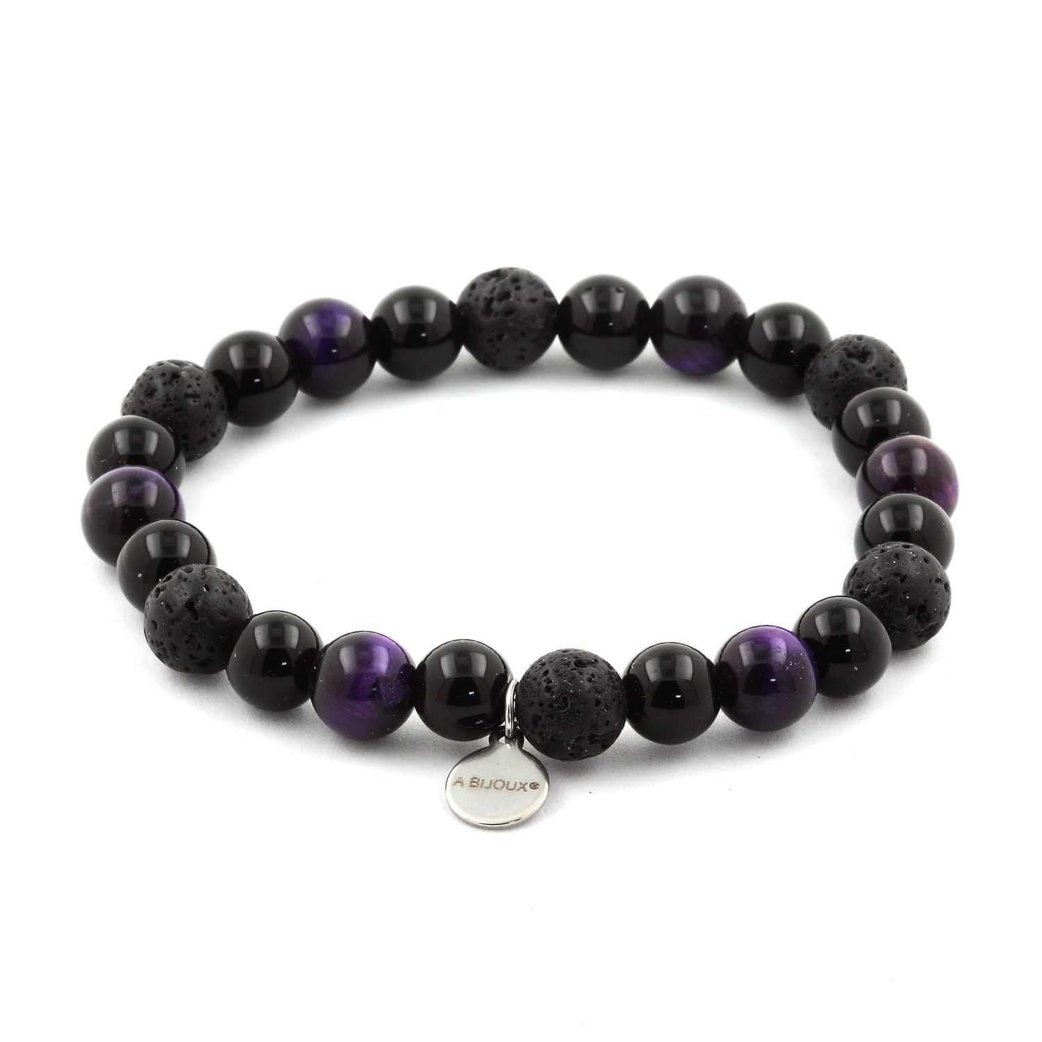 Bracelet Perles Oeil de Tigre violet + Lave + Agate noire de 8 mm.