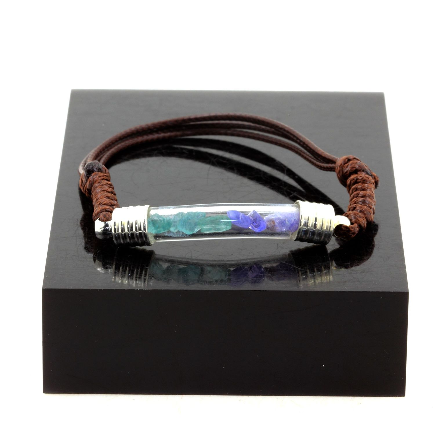 Dimensions : ajustable de 16 à 24 cm. Bracelet en corde et verre (taille du tube 40 mm x 6 mm ) avec des pierres brutes naturelles.