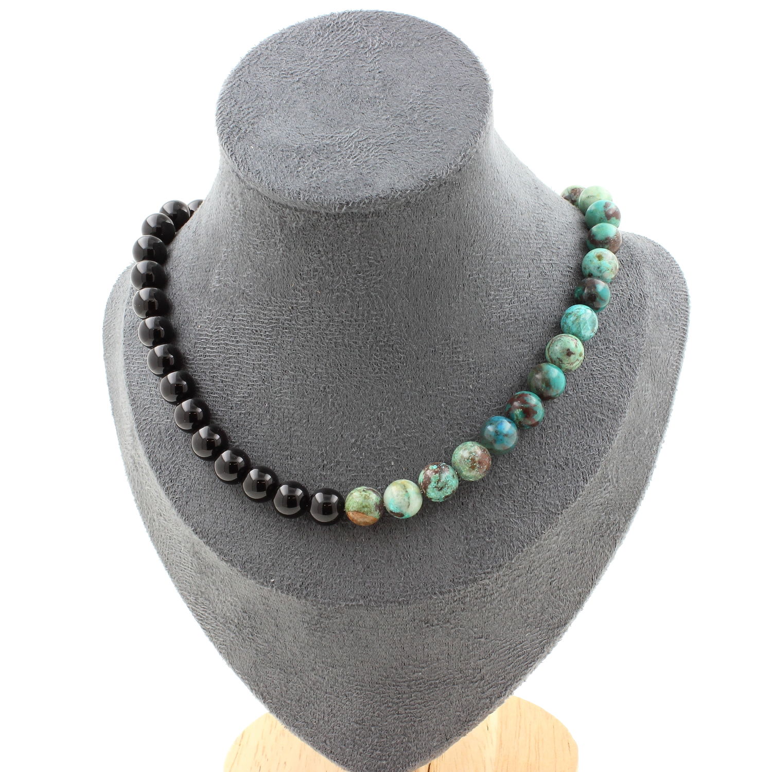 Chrysocolla from Namibia quality 7A + Black Agate 8 mm beads necklace, stainless steel chain length 45 cm. We can make it to your length on request (price varies depending on the length of the necklace). Made in France in our A Bijoux workshop. Delivered in a box pouch. Necklace for women, men, children. Discover more than 1000 models of necklaces made by the A Bijoux brand with new arrivals every day.