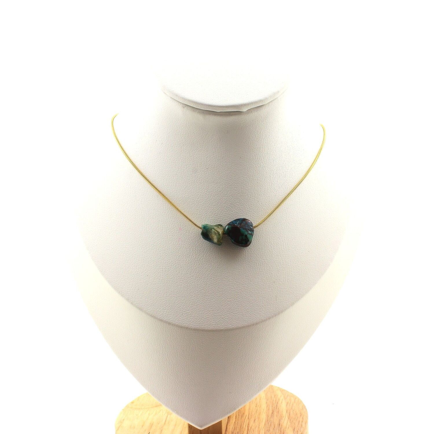 Chrysocolla from the USA 2 beads necklace, golden stainless steel chain length 45 cm. We can make it to your length on request. Made in France in our A Bijoux workshop. Delivered in a box pouch. Necklace for women, men, children. Discover more than 1000 models of necklaces made by the A Bijoux brand with new arrivals every day.