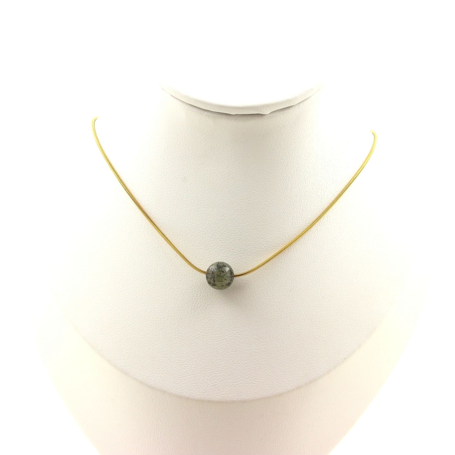 Collier 1 perle Agate Indienne 8 mm chaine en acier doré inoxydable longueur 45 cm. Nous pouvons le fabriquer à votre longueur sur demande. Fabriqué en France dans notre atelier A Bijoux.