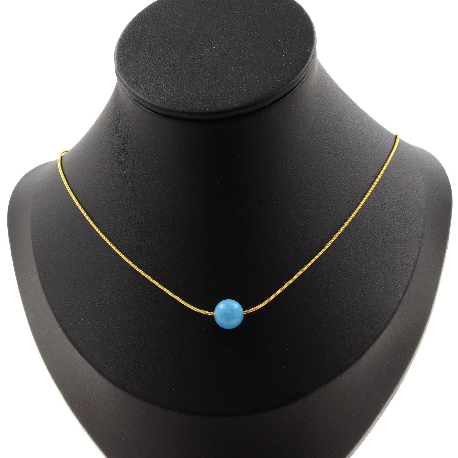 Collier 1 perle Calcédoine bleu 8 mm chaine en acier doré inoxydable longueur 45 cm. Nous pouvons le fabriquer à votre longueur sur demande. Fabriqué en France dans notre atelier A Bijoux.
