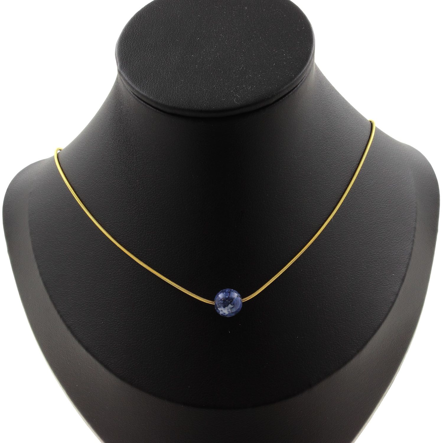 Collier 1 perle Jaspe bleu 8 mm chaine en acier doré inoxydable longueur 45 cm. Nous pouvons le fabriquer à votre longueur sur demande. Fabriqué en France dans notre atelier A Bijoux.