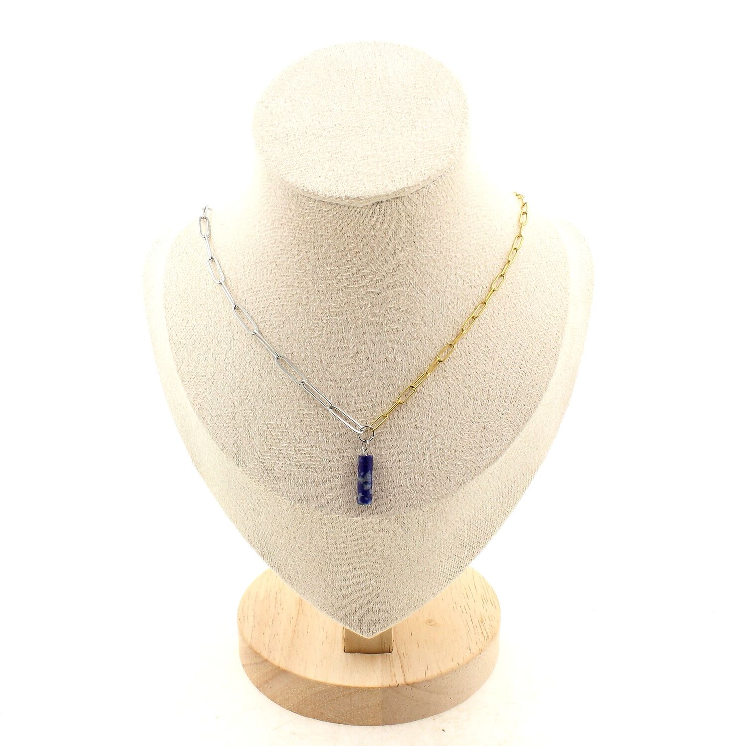 Collier 1 Perle Lapis Lazuli 4x13mm cylindre double chaine 2 tons (2,5x6,5 & 3,5x11mm) en acier doré inoxydable longueur 45 cm. Nous pouvons le fabriquer à votre longueur sur demande. Fabriqué en France dans notre atelier A Bijoux.