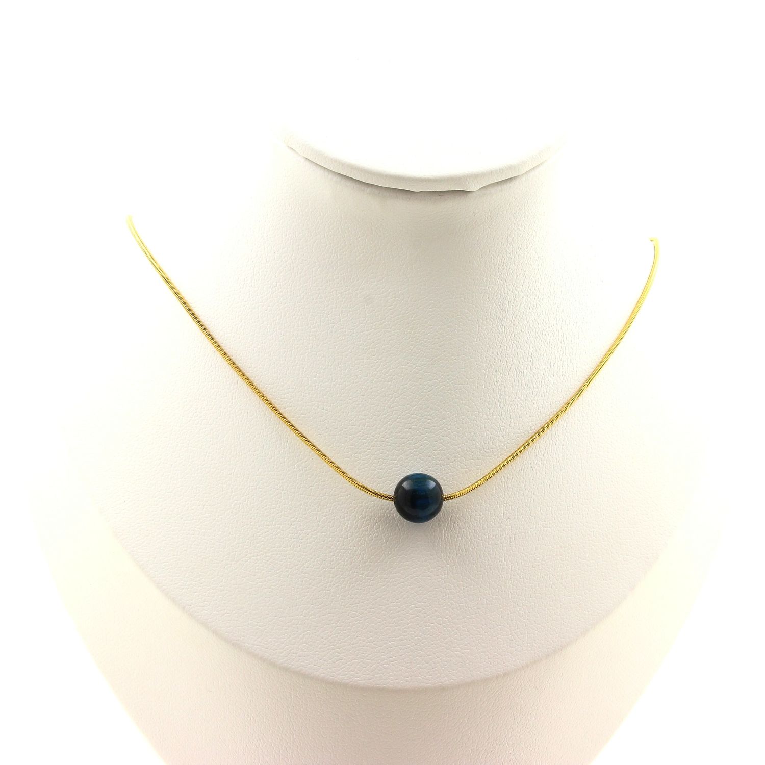 Collier 1 perle Oeil de Tigre bleu clair 8 mm chaine en acier doré inoxydable longueur 45 cm. Nous pouvons le fabriquer à votre longueur sur demande. Fabriqué en France dans notre atelier A Bijoux.