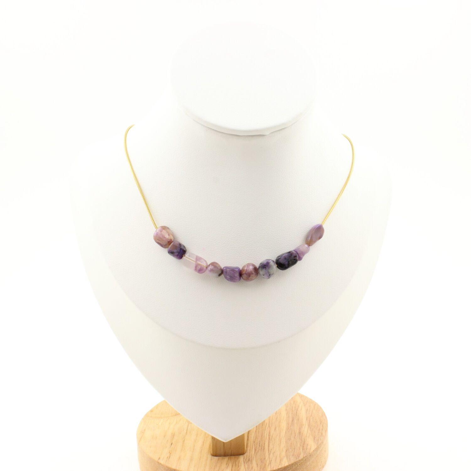 Collier 10 perles Charoite de Russie de forme libre 5 mm-8 mm chaine en acier doré inoxydable longueur 45 cm. Nous pouvons le fabriquer à votre longueur sur demande . Fabriqué en France dans notre atelier A Bijoux.