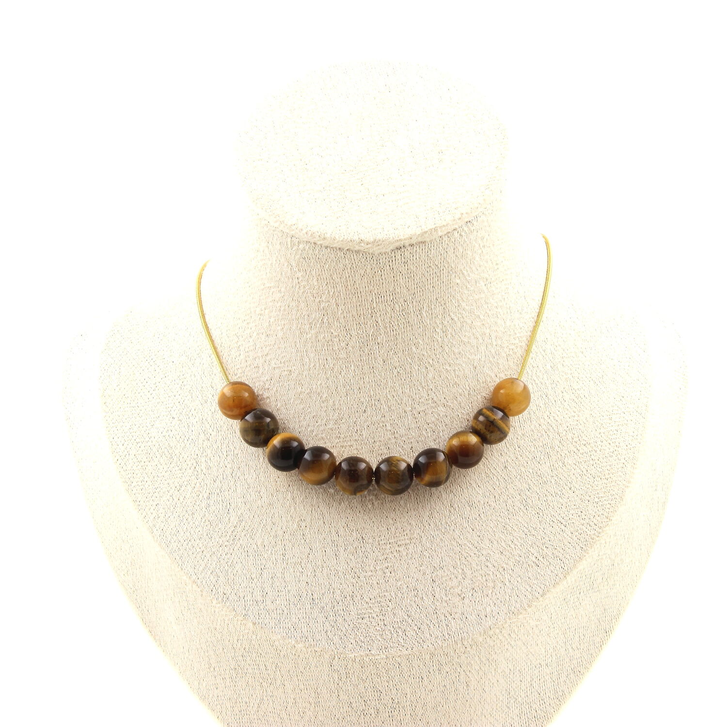 Collier 10 perles Oeil de Tigre 8 mm. Chaine en acier doré inoxydable