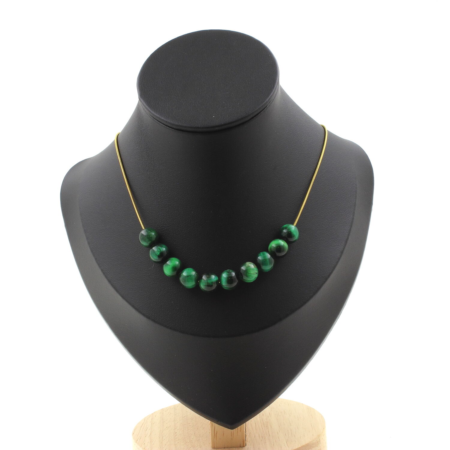 Collier 10 perles Oeil de Tigre vert 8 mm chaine en acier doré inoxydable longueur 45 cm. Nous pouvons le fabriquer à votre longueur sur demande . Fabriqué en France dans notre atelier A Bijoux.