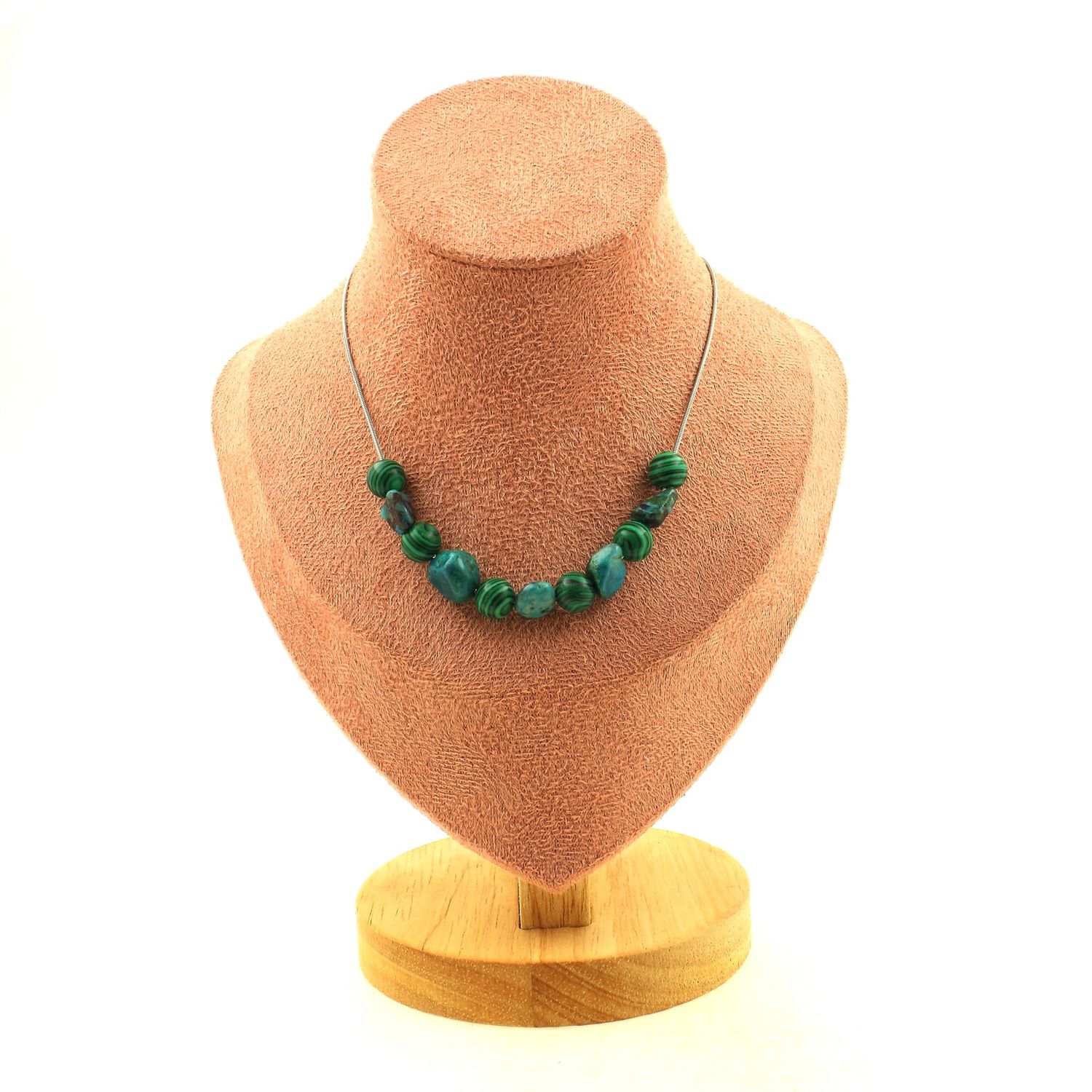 Collier 11 perles Chrysocolle des USA + Malachite 8 mm Chaine en acier inoxydable