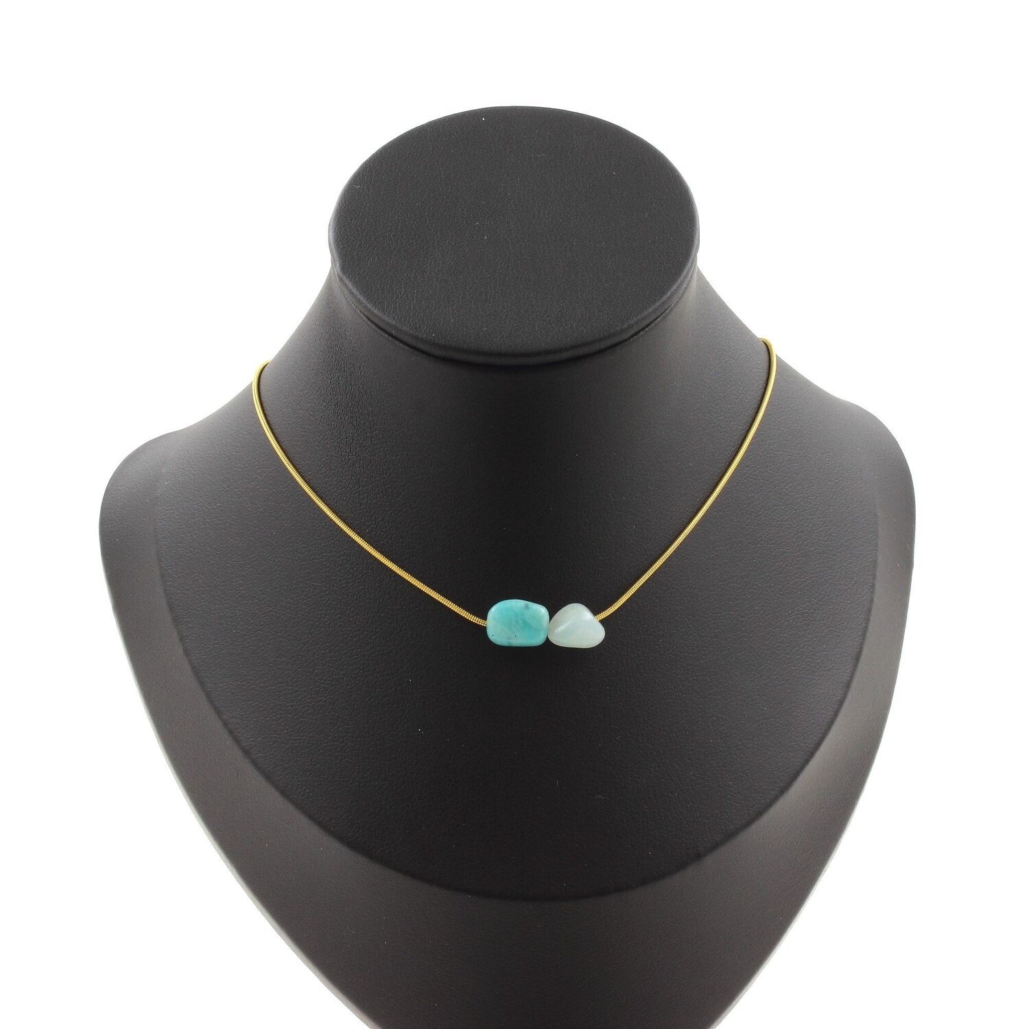 Collier 2 perles Amazonite du Brésil. Chaine en acier doré inoxydable