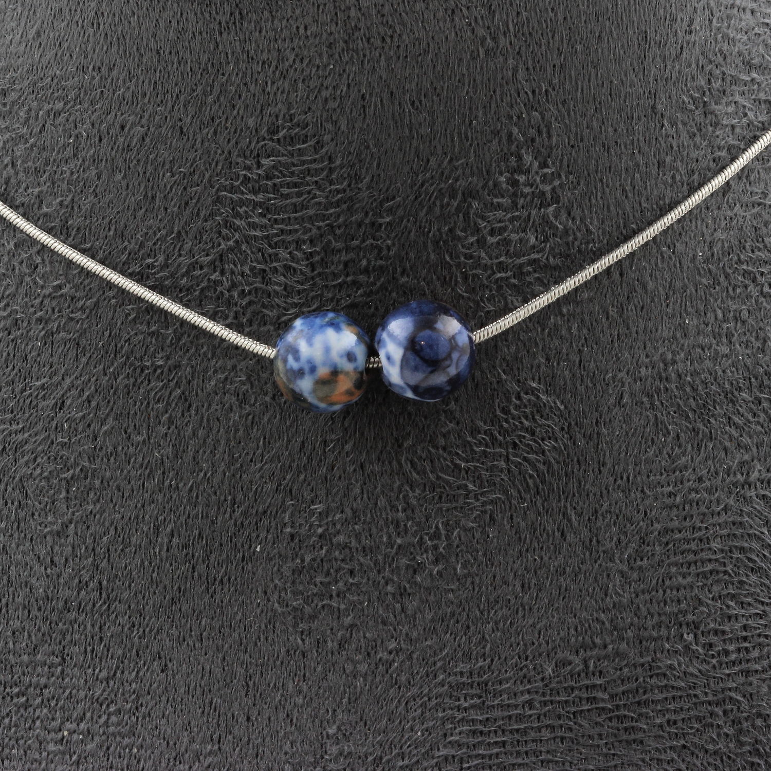 Collier 2 perles Jaspe bleu 8 mm. Chaine en acier inoxydable