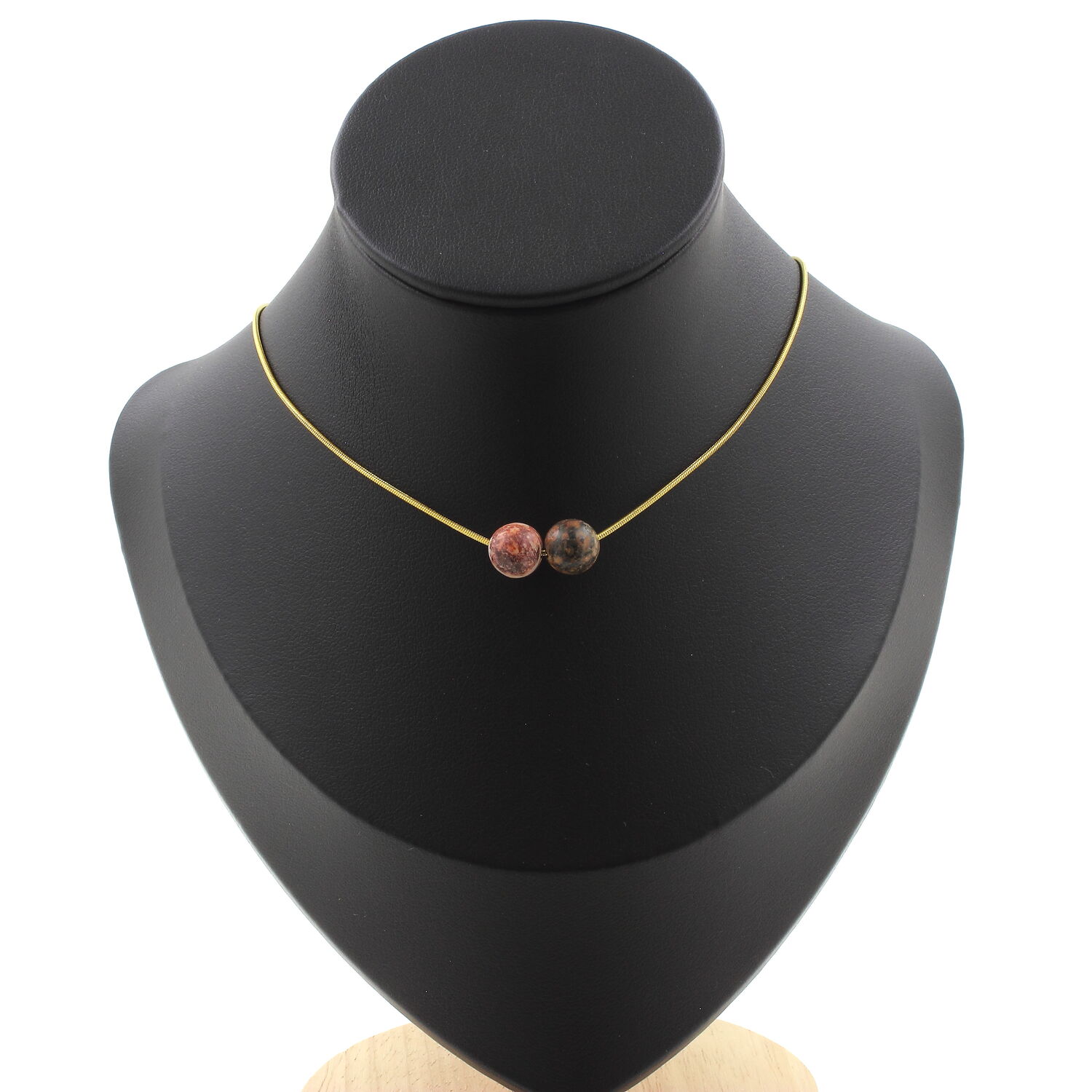 Collier 2 perles Jaspe léopard 8 mm. Chaine en acier doré inoxydable