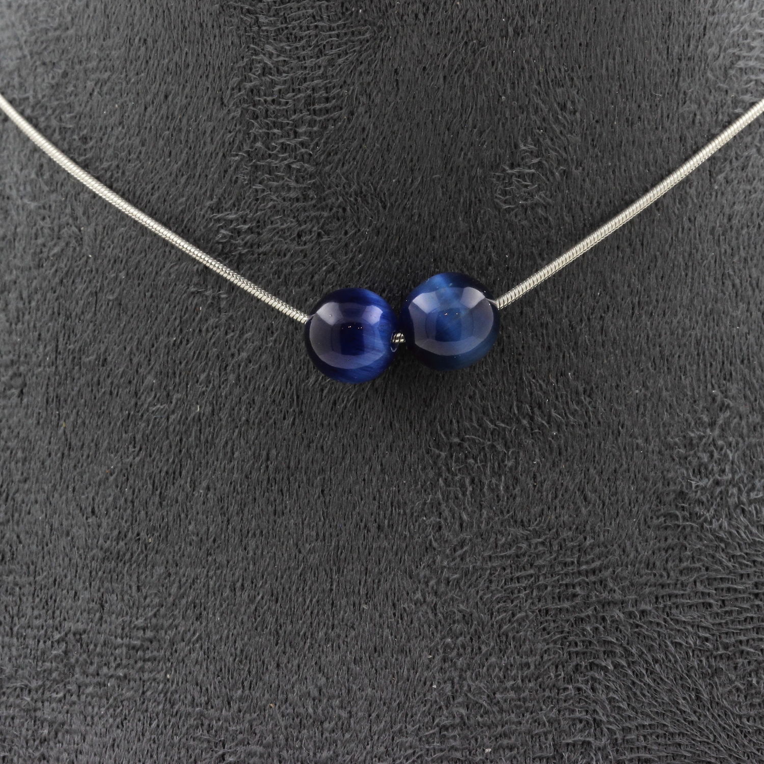 Collier 2 perles Oeil de Tigre Bleu 8 mm chaine en acier inoxydable longueur 45 cm. Nous pouvons le fabriquer à votre longueur sur demande. Fabriqué en France dans notre atelier A Bijoux.