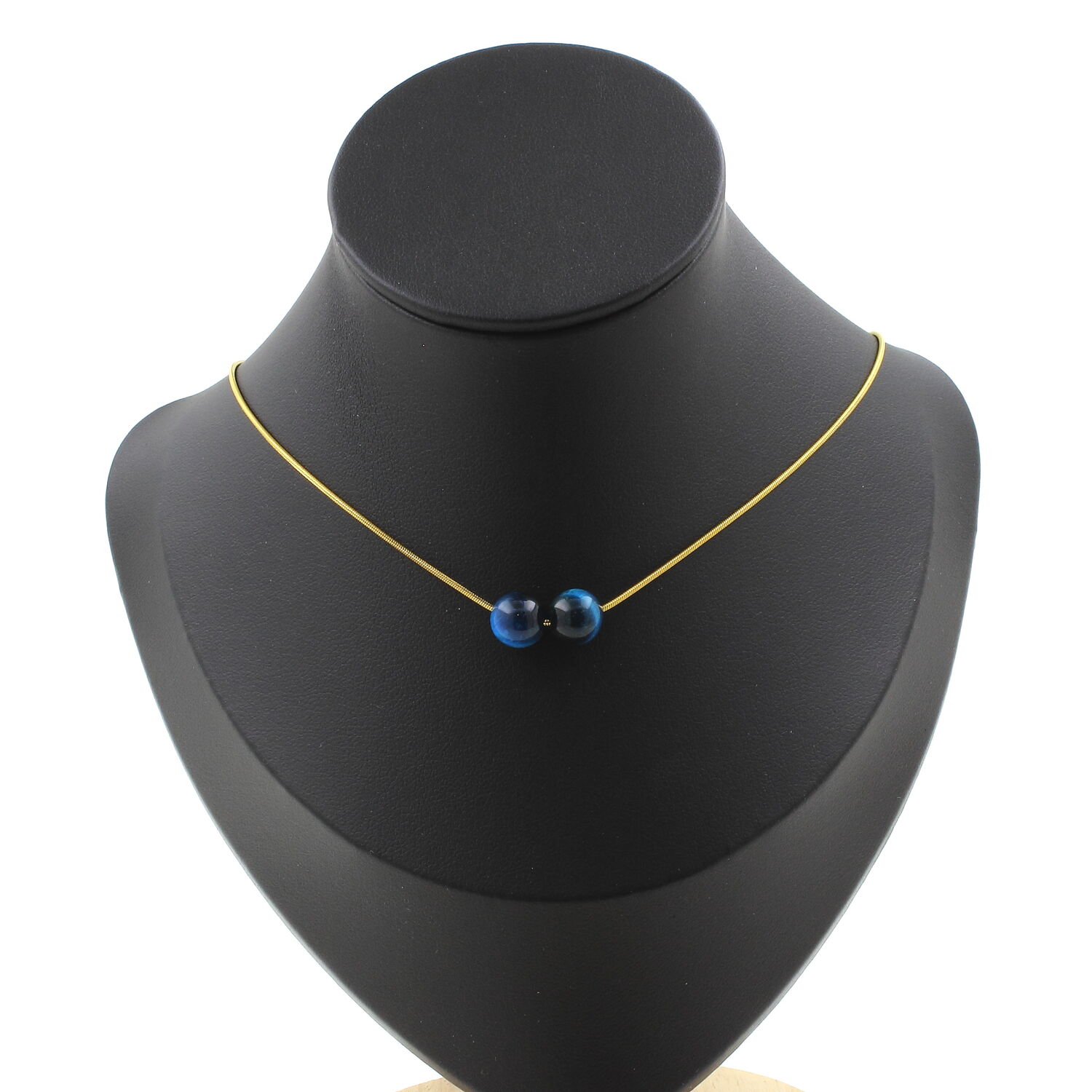 Collier 2 perles Oeil de Tigre bleu clair 8 mm chaine en acier doré inoxydable longueur 45 cm. Nous pouvons le fabriquer à votre longueur sur demande. Fabriqué en France dans notre atelier A Bijoux.