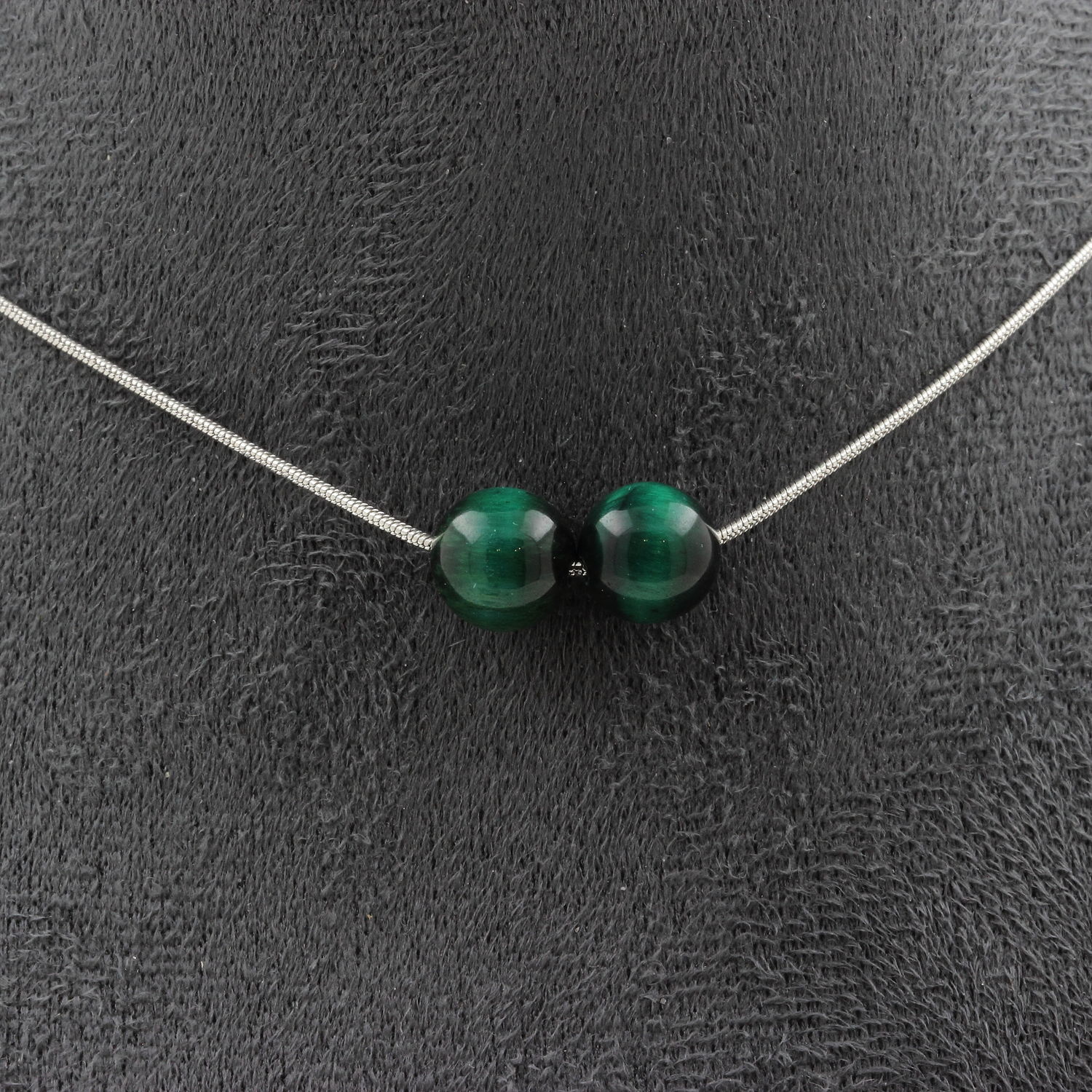 Collier 2 perles Oeil de Tigre vert 8 mm. Chaine en acier inoxydable