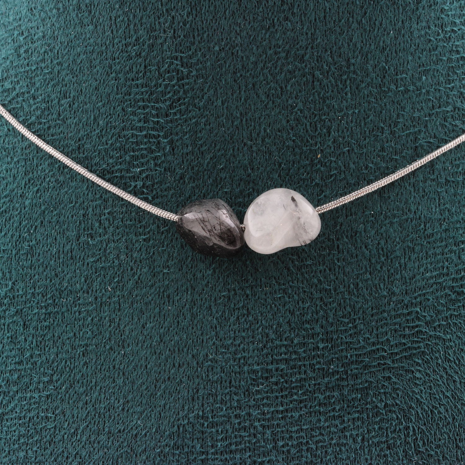 Collier 2 perles Quartz à inclusions de Tourmaline du Brésil Chaine en acier inoxydable