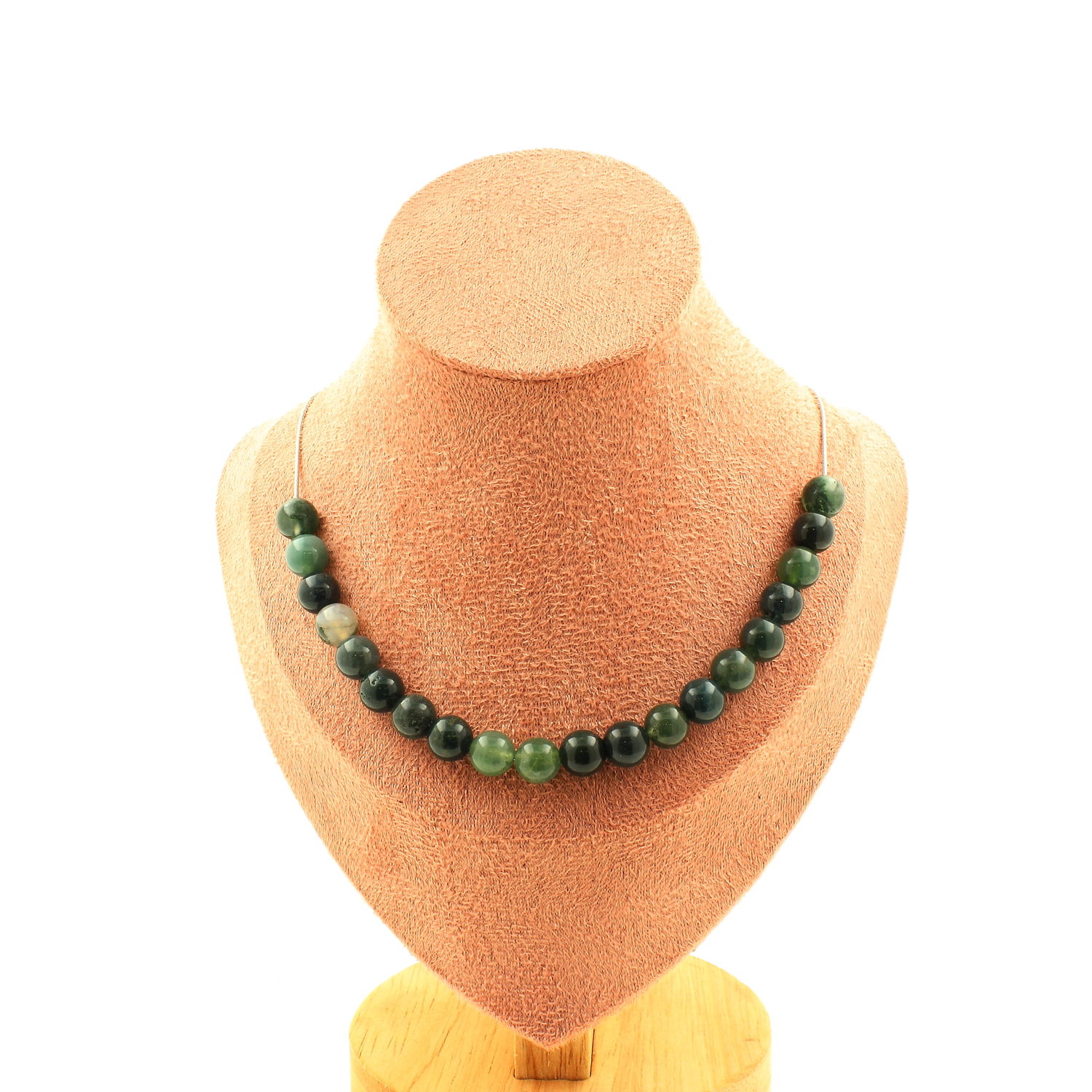 Collier 10 perles Agate mousse 8 mm. Chaine en acier inoxydable