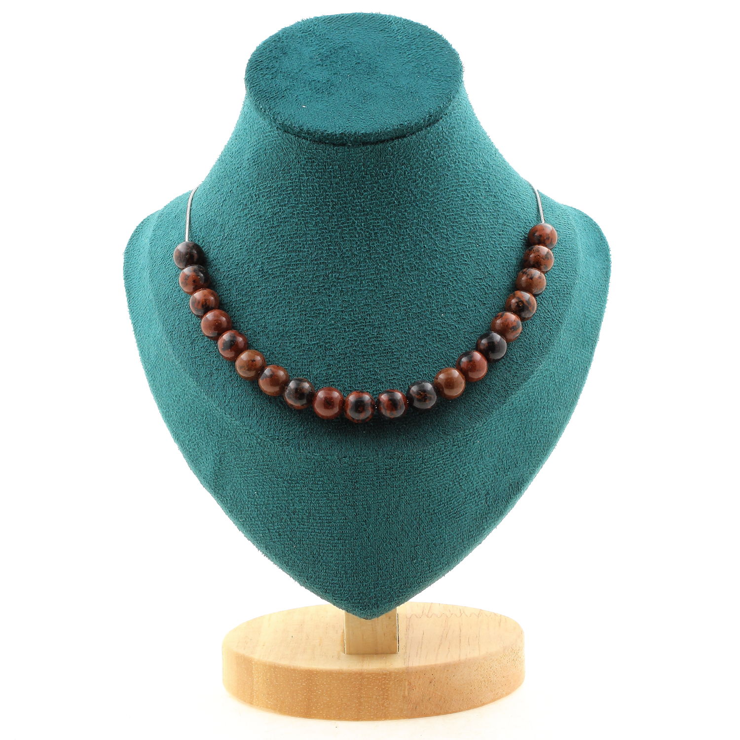 Collier 20 perles Obsidienne mahogany 8 mm. Chaine en acier inoxydable