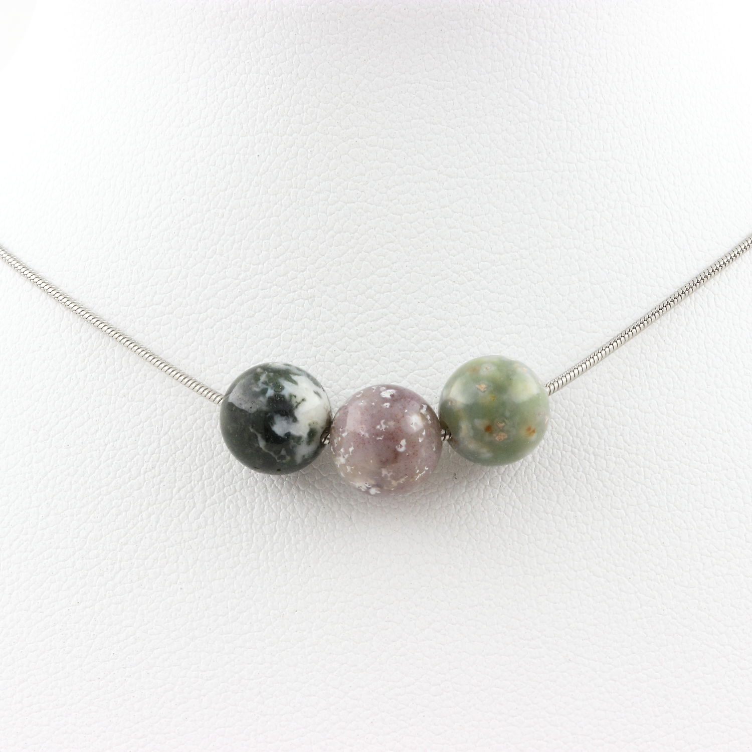 Collier 3 perles Agate Indienne 8 mm chaine en acier inoxydable longueur 45 cm. Nous pouvons le fabriquer à votre longueur sur demande. Fabriqué en France dans notre atelier A Bijoux.