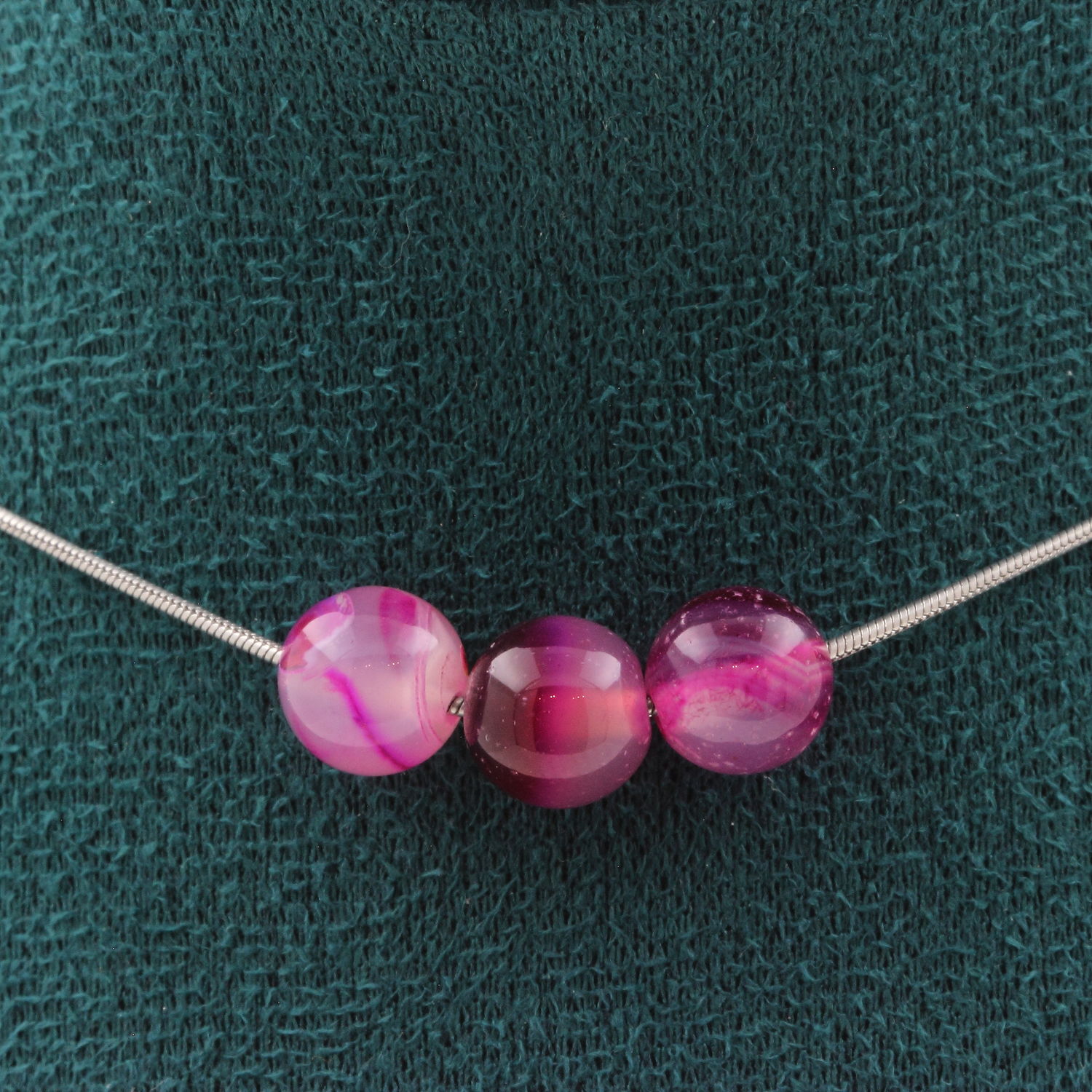 Collier 3 perles Agate rubanée rose 8 mm. Chaine en acier inoxydable
