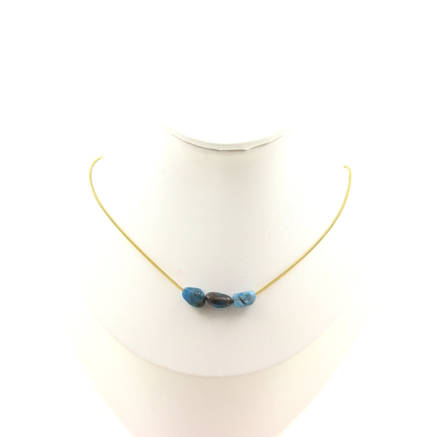 Collier 3 perles Apatite bleu du Brésil. Chaine en acier doré inoxydable