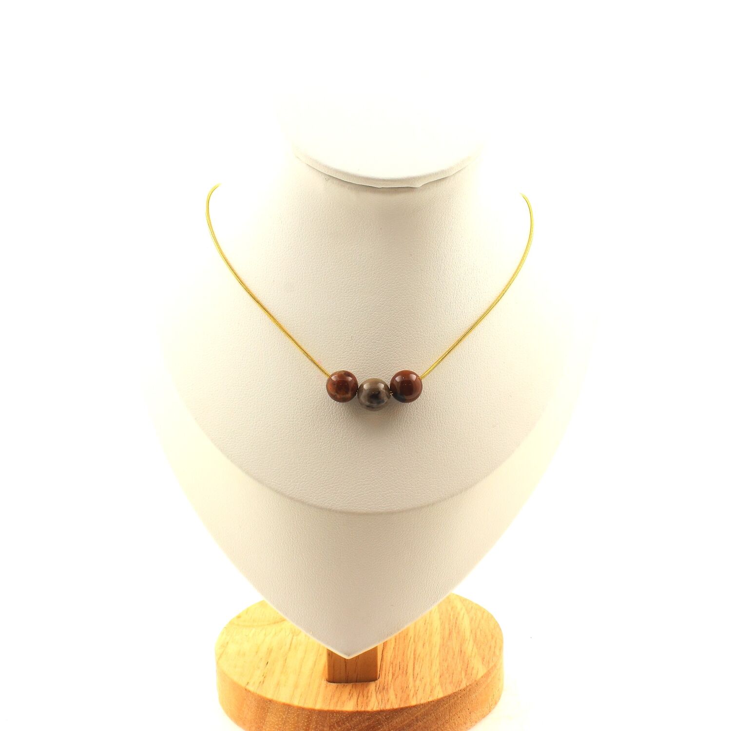 Collier 3 perles Bois pétrifié 8 mm. Chaine en acier doré inoxydable
