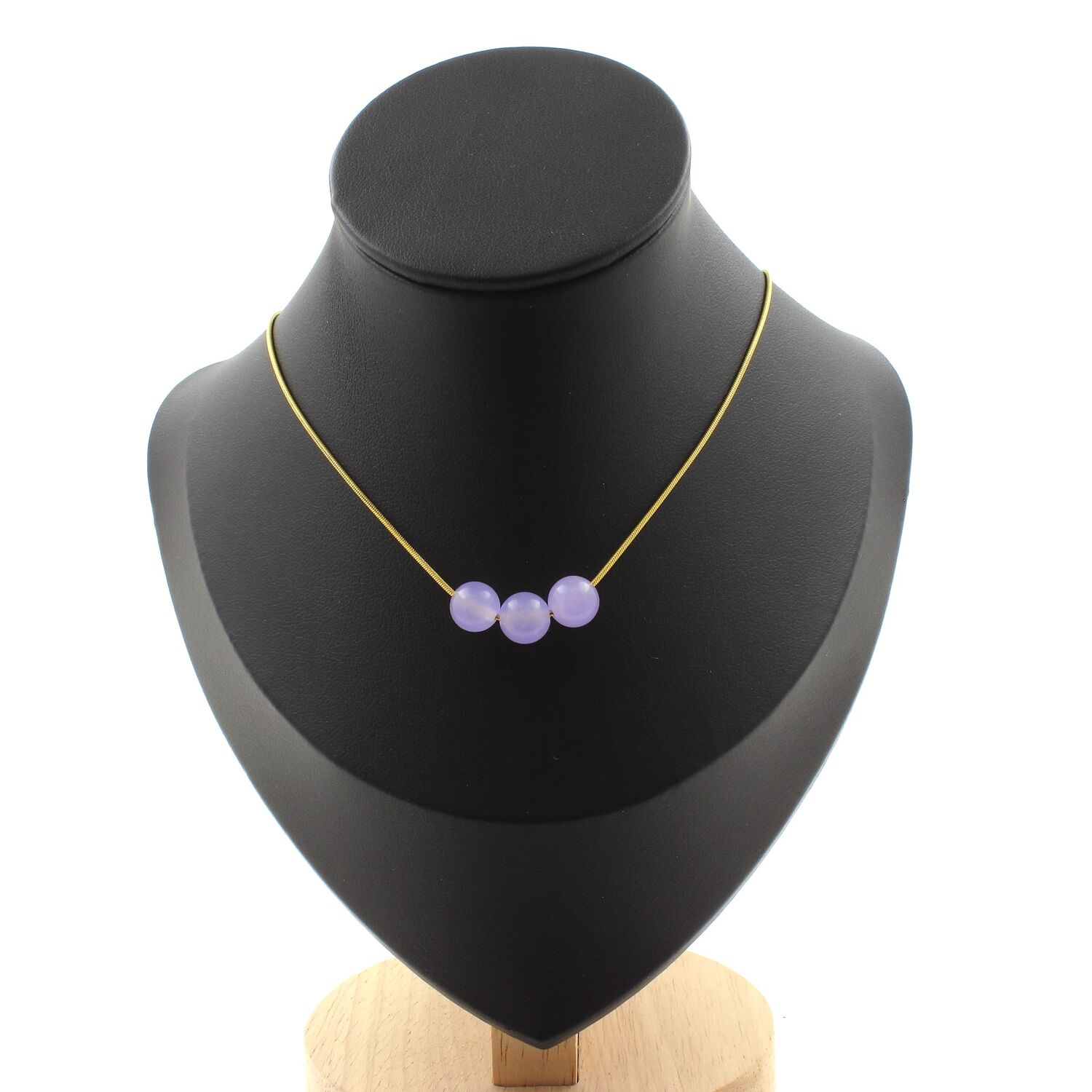 Collier 3 perles Calcédoine lavande 8 mm chaine en acier doré inoxydable longueur 45 cm. Nous pouvons le fabriquer à votre longueur sur demande. Fabriqué en France dans notre atelier A Bijoux.