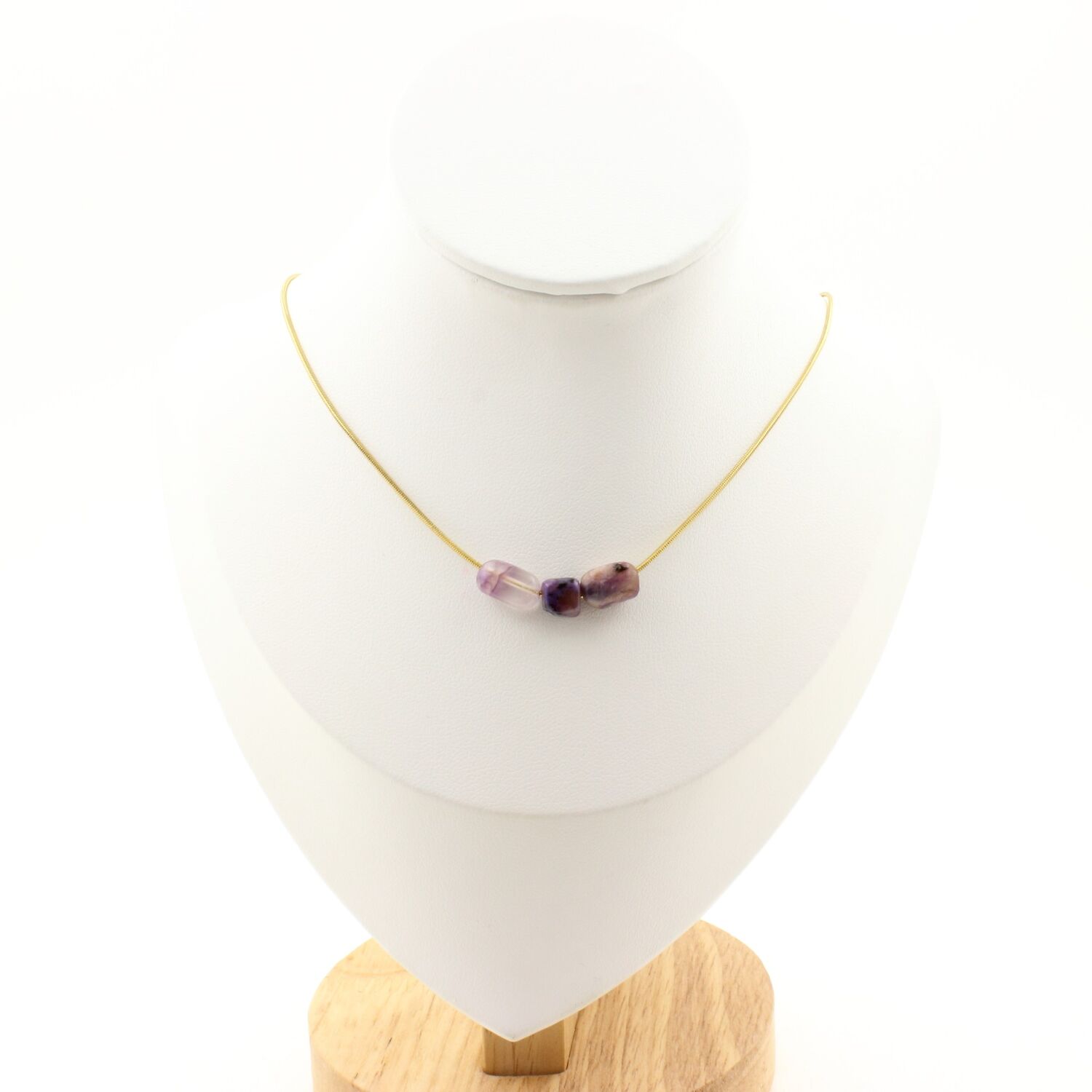 Collier 3 perles Charoite de Russie. Chaine en acier doré inoxydable
