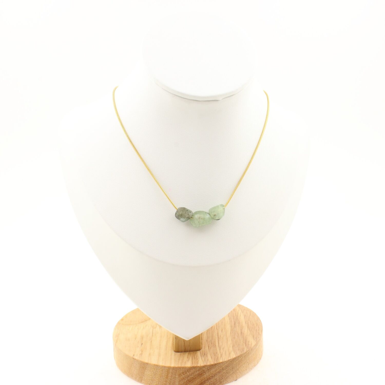 Collier 3 perles Cyanite verte du Brésil. Chaine en acier doré inoxydable