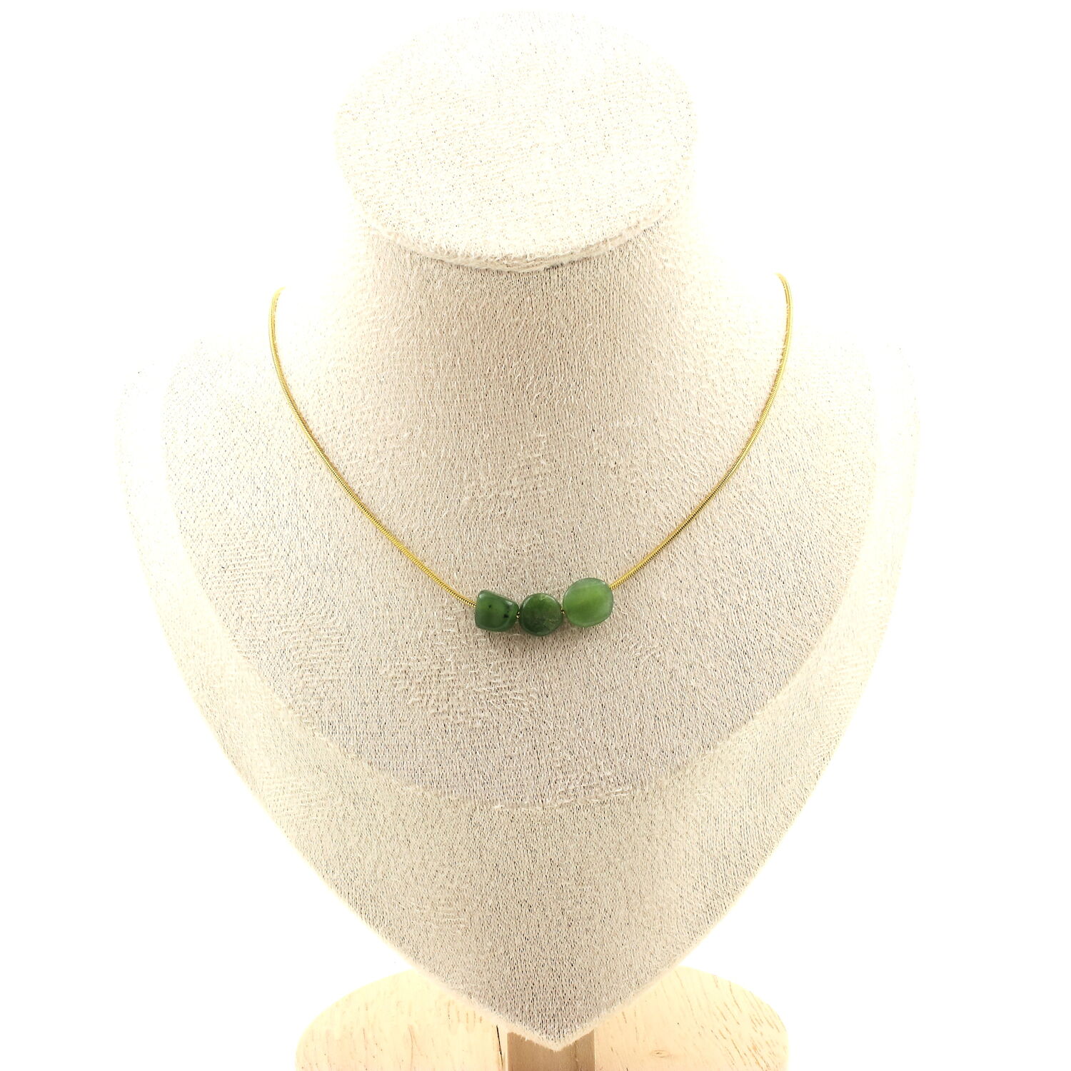 Collier 3 perles Jade néphrite de Sibérie (Russie) de forme libre 5 mm-8 mm chaine en acier doré inoxydable longueur 45 cm. Nous pouvons le fabriquer à votre longueur sur demande. Fabriqué en France dans notre atelier A Bijoux.