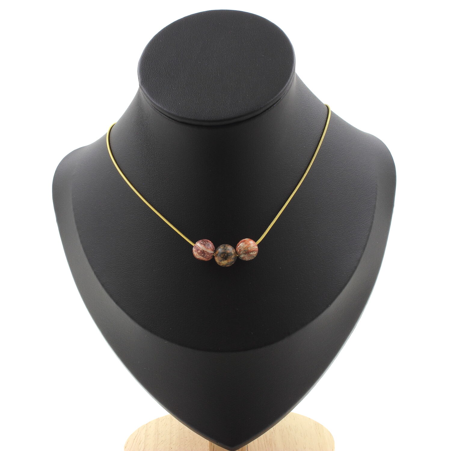 Collier 3 perles Jaspe léopard 8 mm. Chaine en acier doré inoxydable
